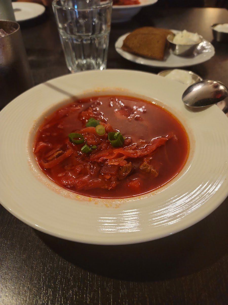 For a heartier option, the Pushkin Burger is a must-try; this juicy beef patty layered with sweet pickled onions and mushrooms brings comfort food to a whole new level for $20. Not to be missed is the Borscht, a traditional beet soup that is as rich in flavor as it is in color, priced at $16. Each dish resonates with authenticity, echoing the sentiments of our customers who have expressed that the food tastes just as delightful as their Ukrainian grandma's cooking!